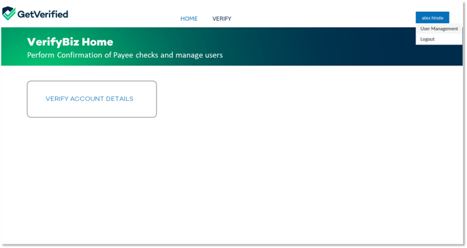 To know if you have Admin Rights, after set up log-in to the VerifyBiz Portal and click on your name in the top right of the screen. If you are set up as an Admin you will see the menu options "User Management" and "Logout". If you are a User, your only menu option will be "Logout".